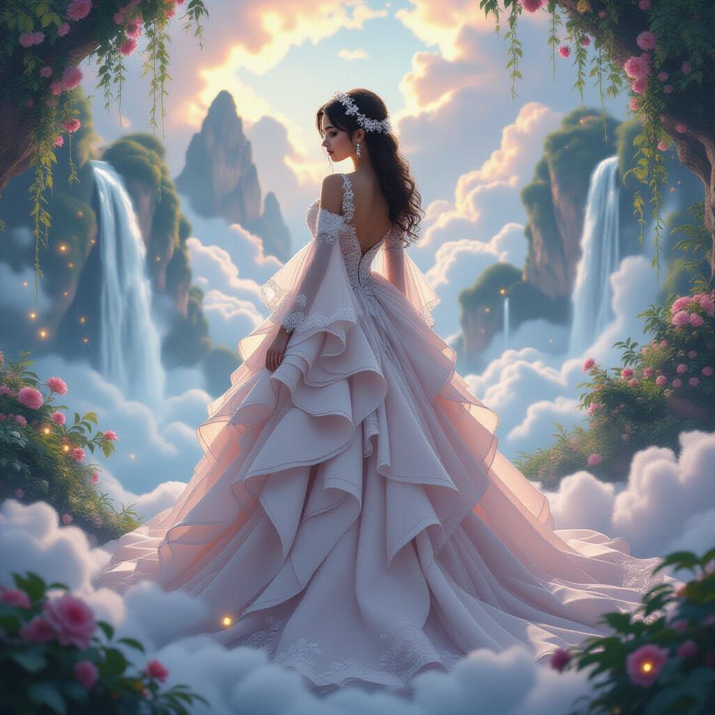 A striking picture of a girl in a couture gown standing in a floating garden. Luminous waterfalls, glowing islands, and ethereal fireflies create a dreamy and romantic atmosphere, in a futuristic style.