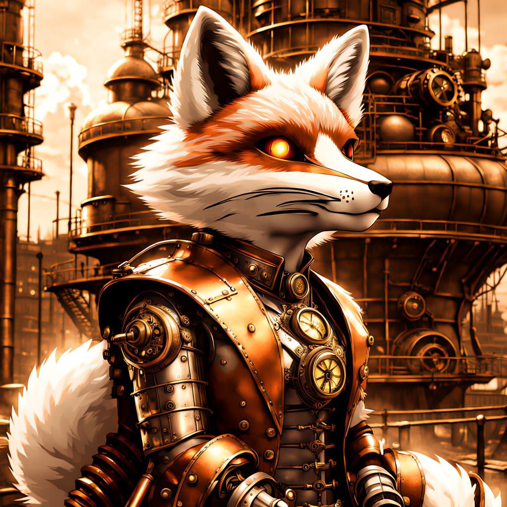 This image shows an anthropomorphic female fox in a steampunk mech suit on an airship dock. The fox has orange and white fur, amber eyes, and copper-tipped ears. The scene is filled with zeppelins and gear-driven machinery.