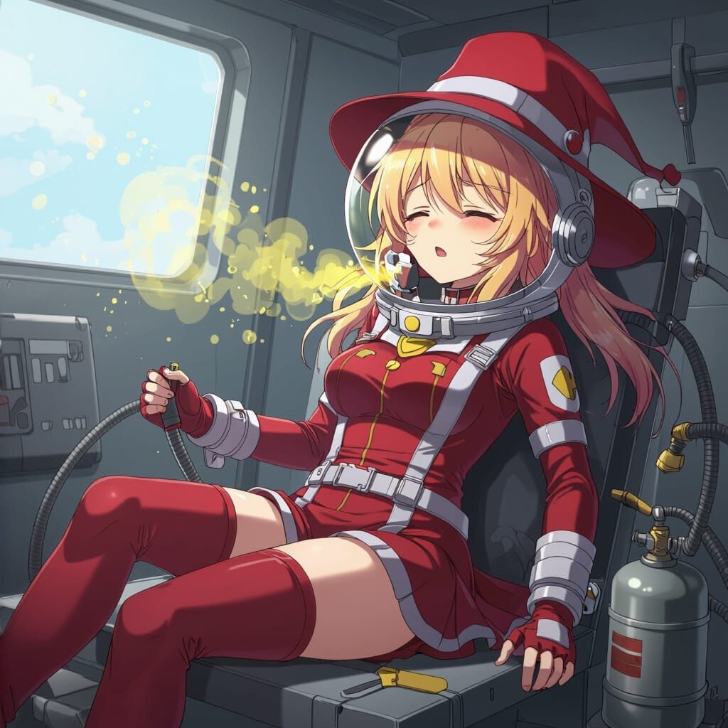 A detailed anime illustration of Flandre Scarlet enduring a bizarre training exercise. She is in a space suit helmet filled with yellow mist, with restricted movements, in a cool training room.