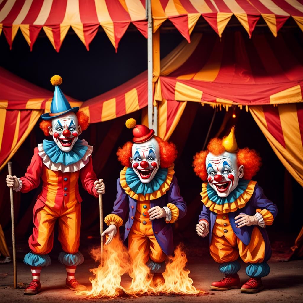 This image depicts sad clowns vanishing within a burning circus tent. The scene evokes a sense of loss and the ephemeral nature of performance in a surreal and dramatic style.