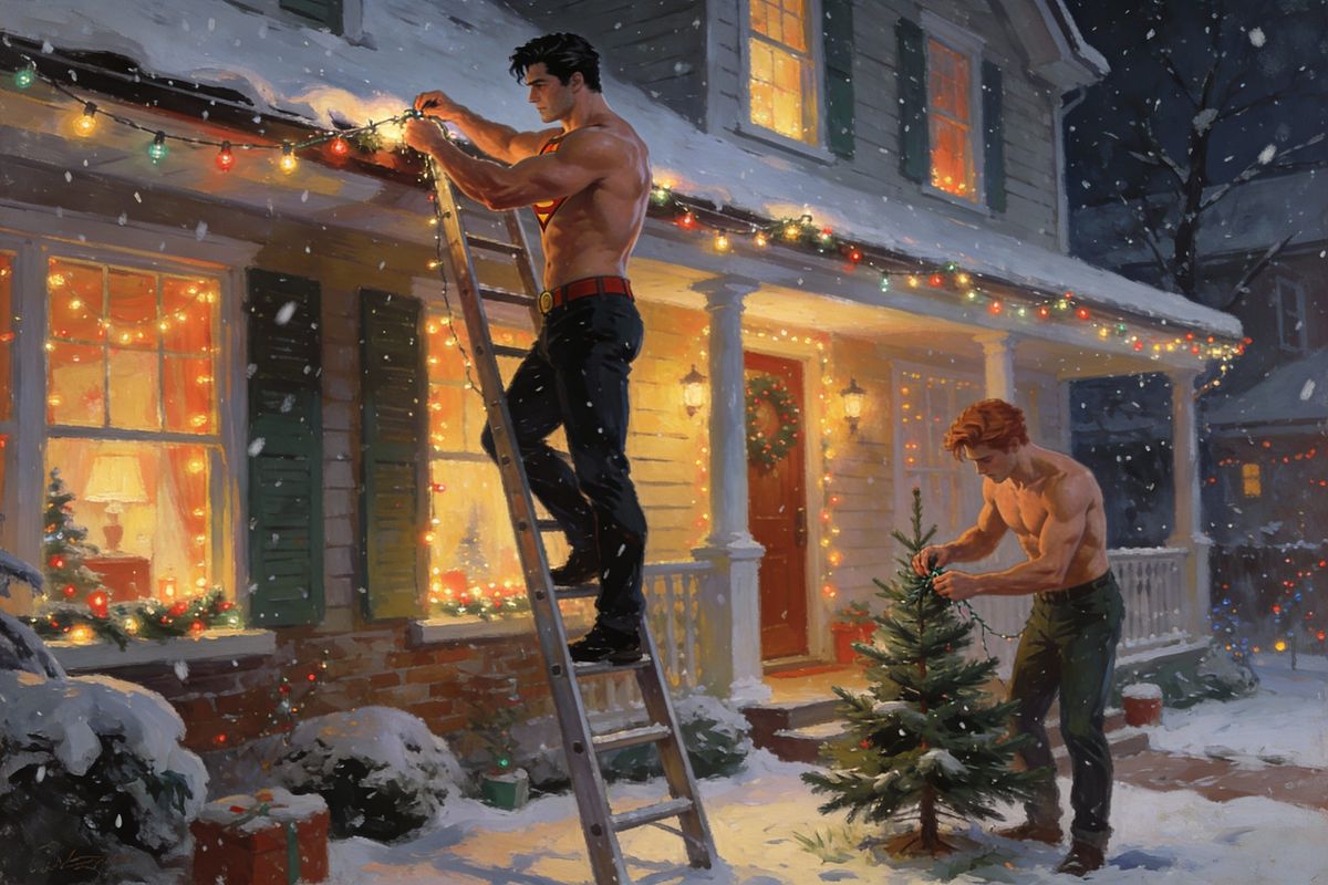 This image shows a handsome Clark Kent on a ladder, decorating a house with Christmas lights. A snowy evening scene with a cozy atmosphere, rendered in a detailed digital matte painting style.