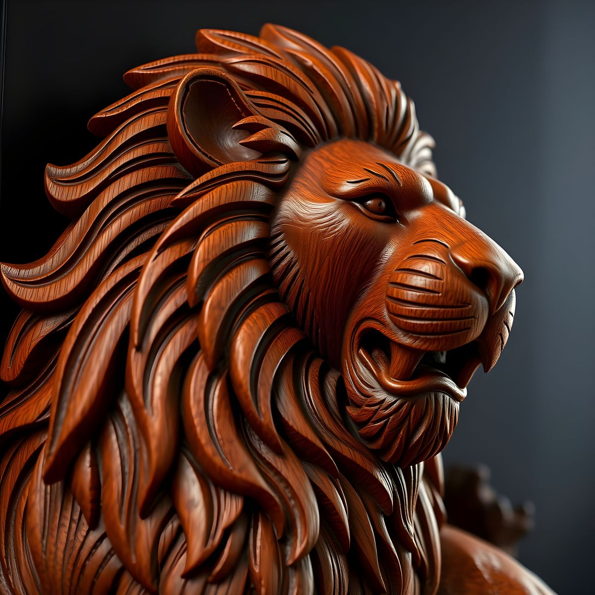 This image shows a meticulously crafted wooden lion sculpture. The red oak carving features fine textures and details, reminiscent of woodworking artistry focused on realism and precision.