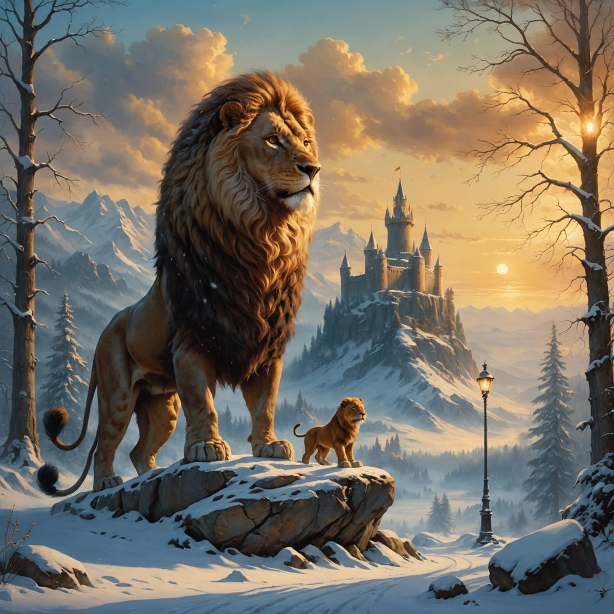 A captivating image of a snowy Narnia landscape featuring a warmly glowing lamppost and Aslan the lion standing on a rock. The artwork evokes a magical atmosphere with soft golden light in an oil painting style.