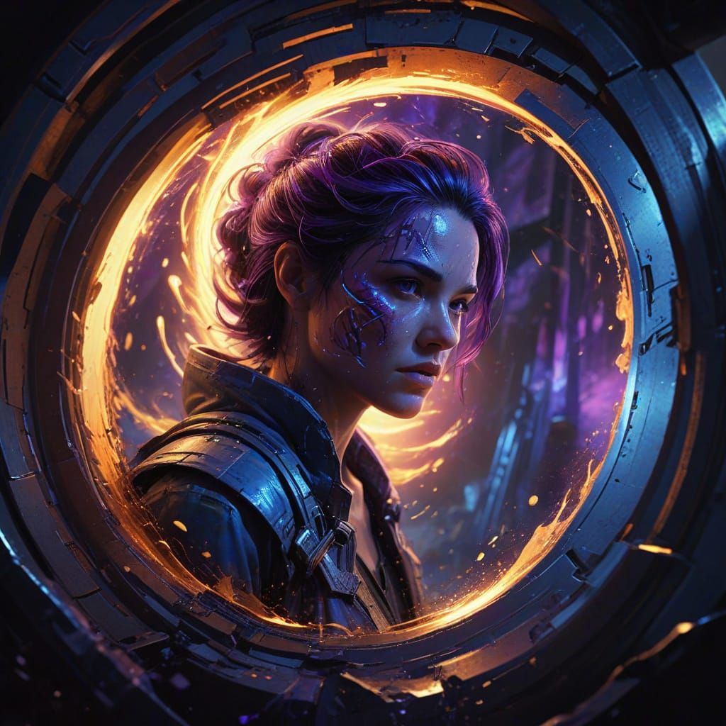 This hyperrealistic concept art depicts a figure facing an open portal. Features shimmering energy, a swirling vortex, and vibrant colors with dramatic shadows and cinematic lighting.
