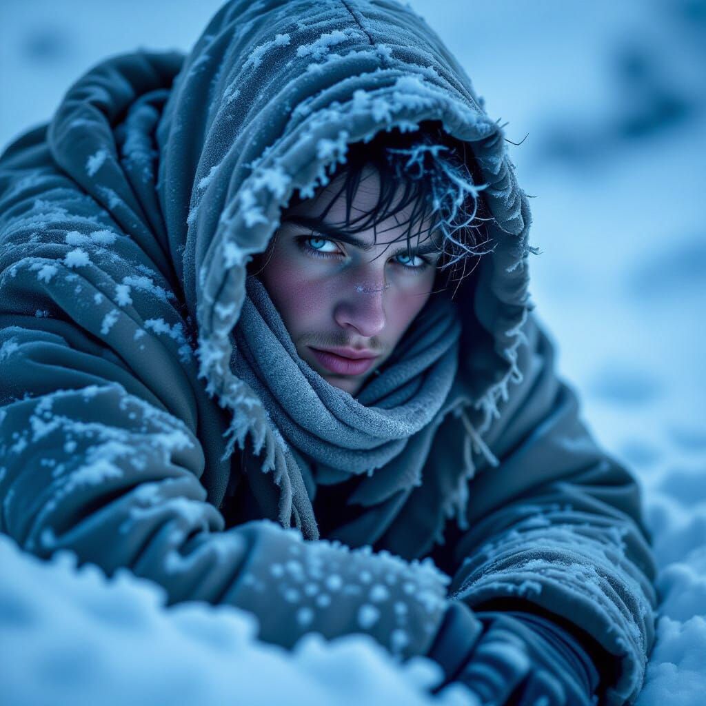 This image depicts a person in worn clothes struggling to survive in a desolate, snow-covered environment. Stark lighting and a desaturated palette emphasize their isolation and the harshness of the cold.