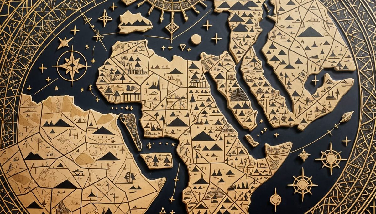 Fictional artistic world map (Earth in a parallel universe) showing fictional countries, fictional borders and symbols