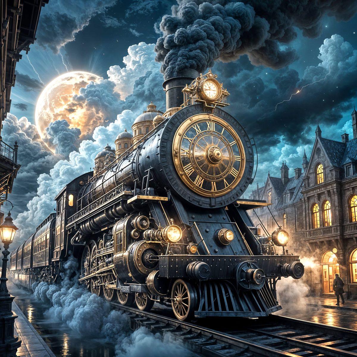 Photographie,détaillée, locomotive à vapeur, train vintage, pleine lune, ciel nocturne nuageux, architecture gothique, bâtiments en pierre, lampadaires anciens, atmosphère brumeuse, réaliste, art numérique, détails complexes, cadran d'horloge doré, train noir et or, voies pavées, éclairage dramatique, brumeux, style gothique, textures détaillées, sombre, étrange, historique, atmosphérique, fantastique, cinématographique.