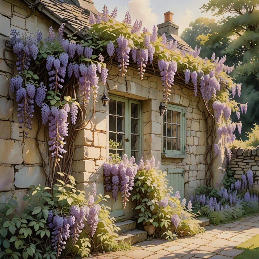 A watercolor image of wisteria flowers growing on a stone cottage. The artwork evokes the style of vintage floral illustrations, with soft focus, pastel colors and warm sunlight.