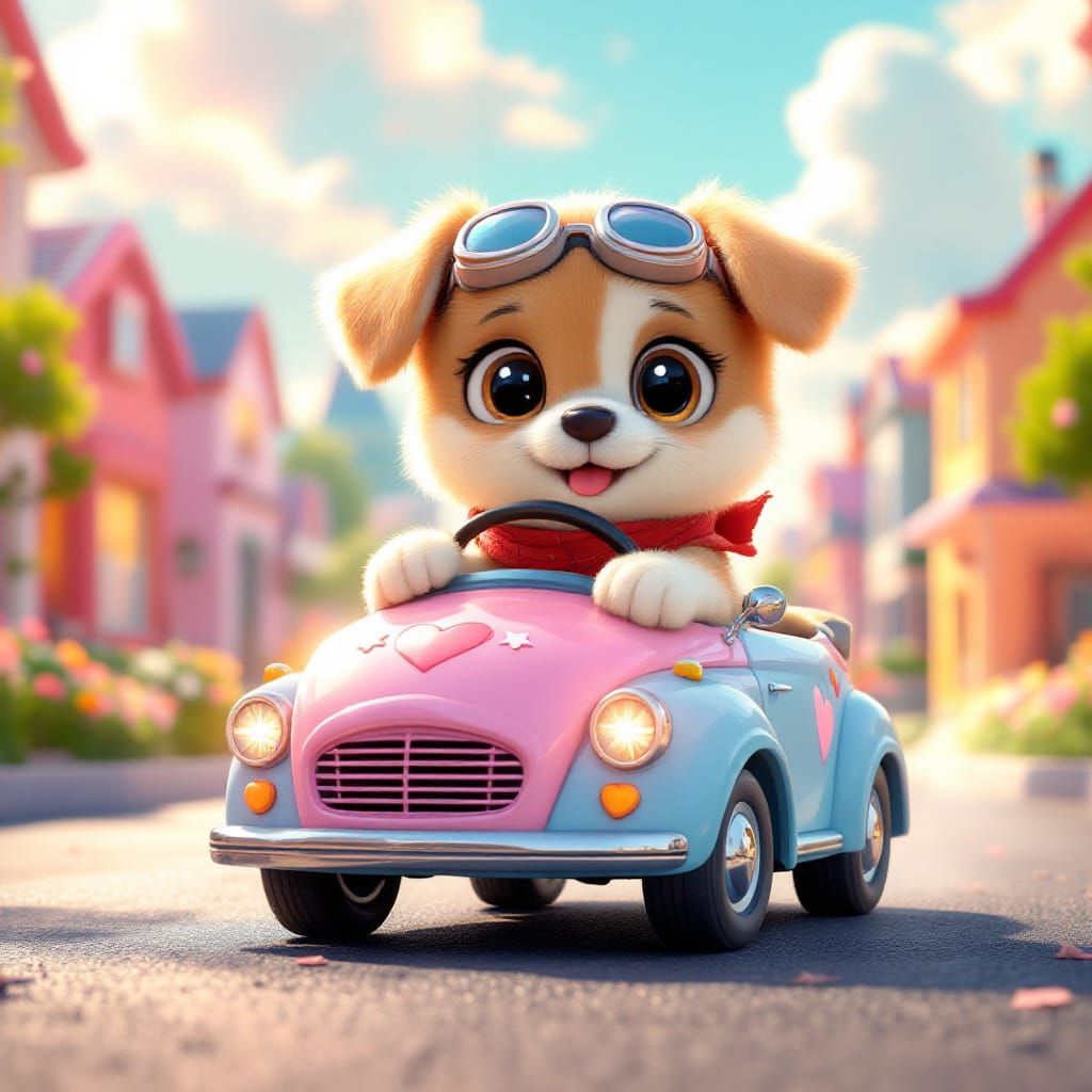 This 3D anime illustration shows a fluffy puppy with big eyes and a red scarf driving a small, rounded pastel car. The scene is set in a colorful town with candy-colored houses under a bright blue sky.