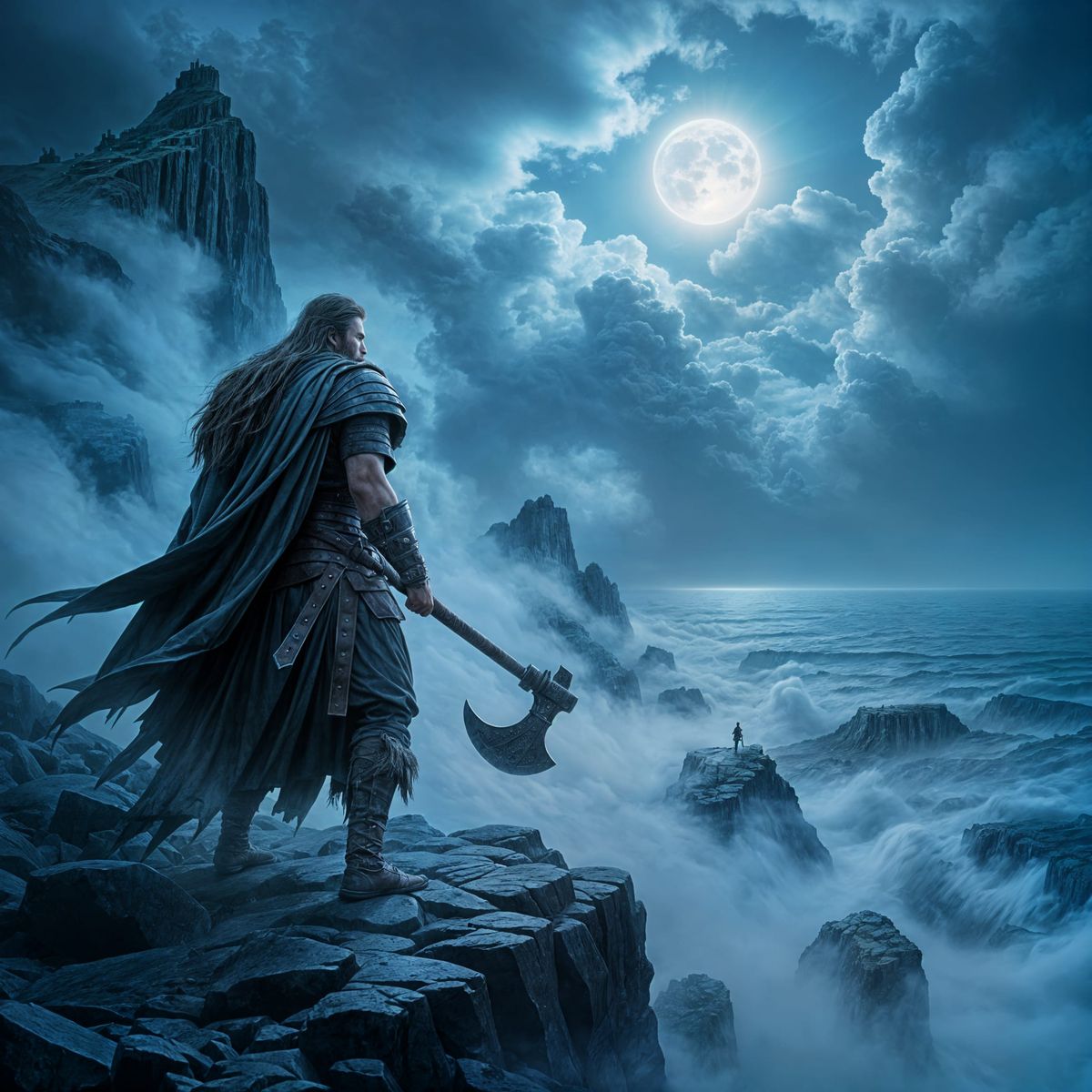 This digital painting depicts a lone viking warrior on a windswept cliff, clutching a runic axe. Cinematic lighting and a moody atmosphere enhance the sense of ancient power and isolation.