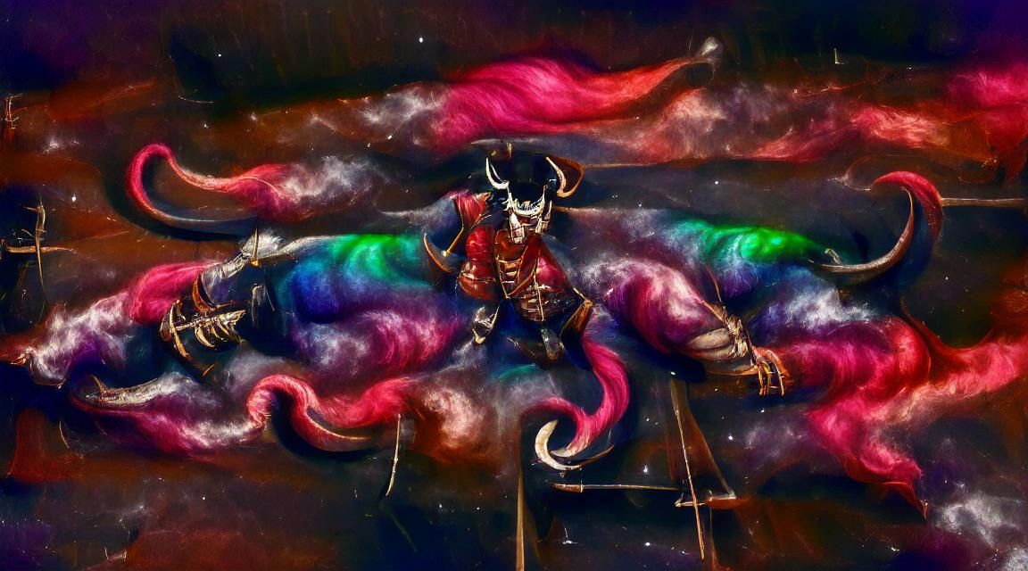 A striking picture of a muscular, red-skinned tiefling pirate captain on a spectral carrack. The ship sails through a nebula filled with cosmic colors, stars, and planets, with glowing sails.