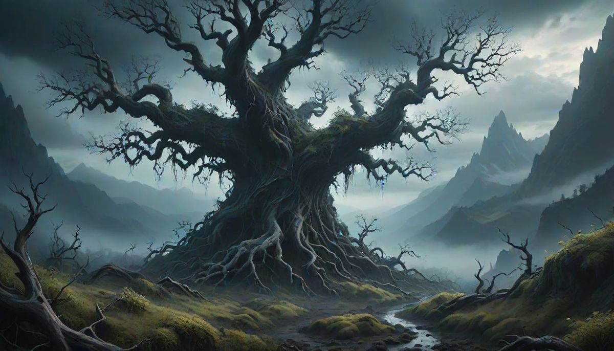 This image depicts a dark fantasy landscape with a dense forest of gnarled trees, intricate textures, and a misty atmosphere. Moody lighting with shafts of light breaks through the rain clouds, while distant mountains loom in the background.