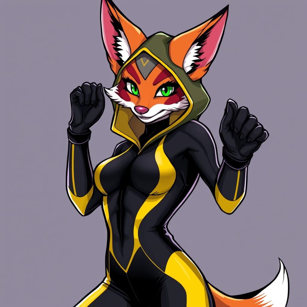 A vibrant, comic book image of a humanoid fox. She has green eyes and a pink nose, and wears a black and yellow jumpsuit. The art style is reminiscent of comic books.