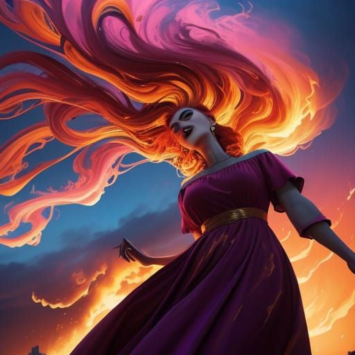 A surrealist oil painting captures a woman in a pink dress dancing amidst swirling smoke and engulfing flames during the end of the world, bathed in warm golden hour light.