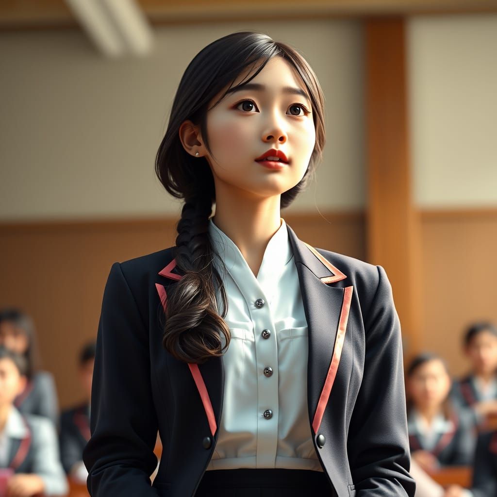 A young woman in a traditional Japanese school uniform stands confidently in front of a classroom, delivering a passionate speech, with intricate details and vibrant colors reminiscent of Art Nouveau style