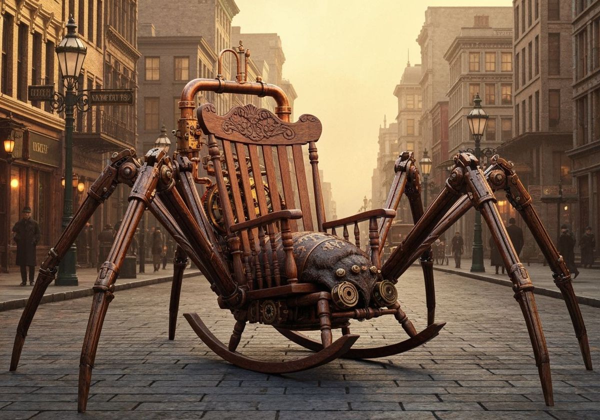 This image shows a mechanical spider with a rocking chair built into its frame, set in a Victorian street scene. The steampunk creation blends vintage aesthetics with intricate mechanical engineering.