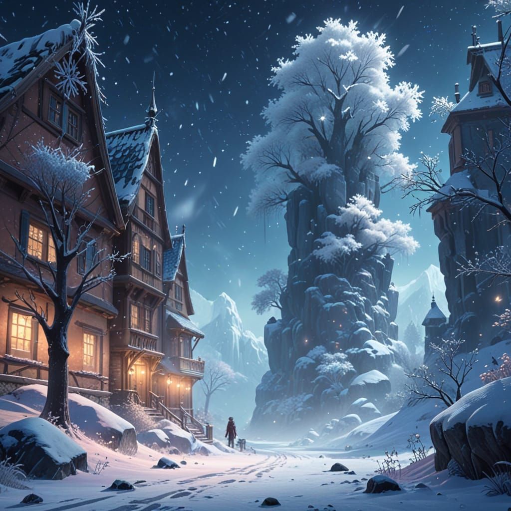 This image shows a wide, cinematic view of a snow-covered winter scene. Soft lighting and pastel colors create a serene, cel-shaded anime aesthetic.