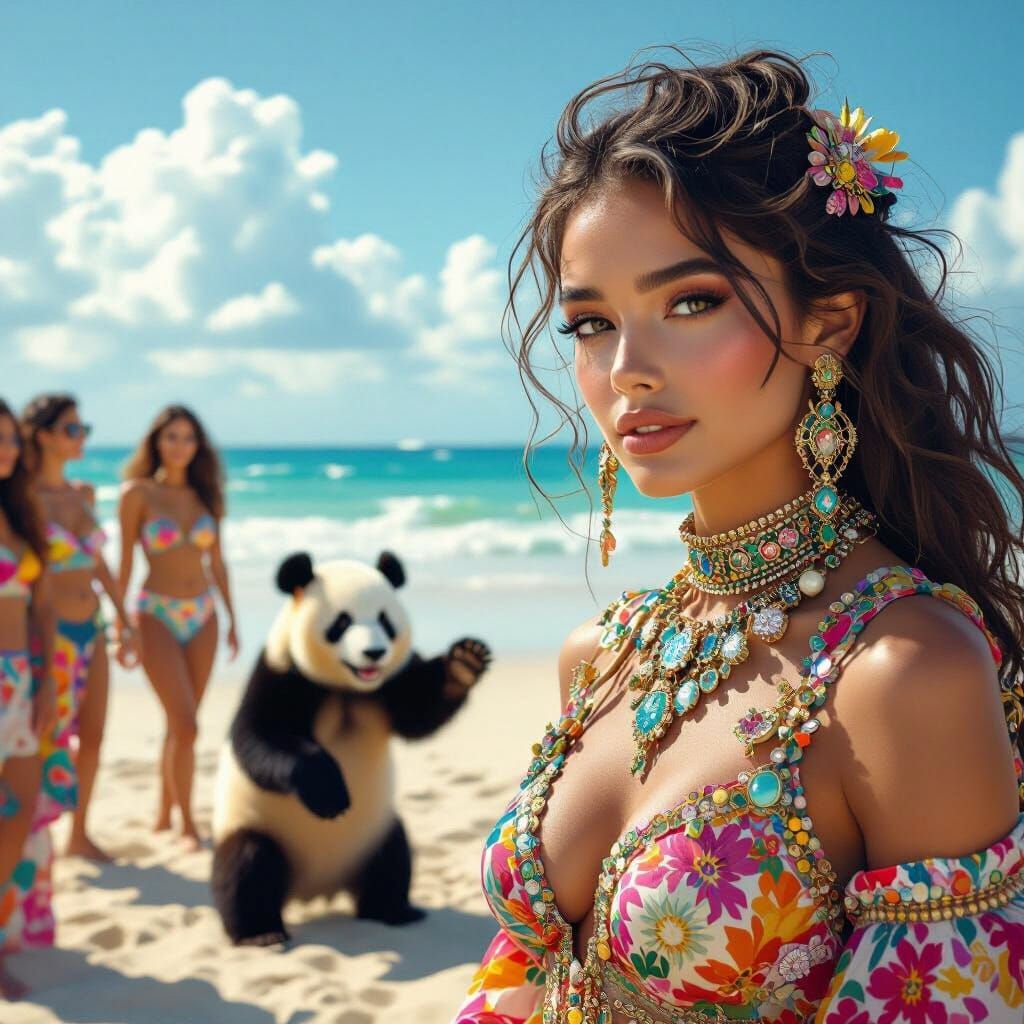 This image shows a hyperrealistic portrait of a beautiful woman in detailed, colorful attire and futuristic jewelry. A cinematic scene unfolds with a joyful panda dancing on a sunny beach.