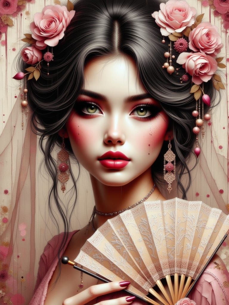 This image features a Spanish woman with a lace veil, red lips, and green eyes. The ethereal realism and impressionist textures create a mystical, dreamy atmosphere with soft colors.