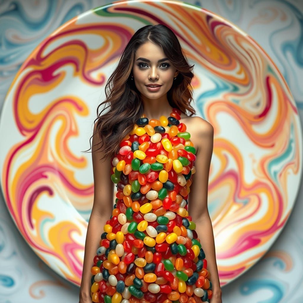 This image showcases a woman wearing a vibrant, jelly bean-made dress against a stunning background of swirling colors, evoking a whimsical and dreamlike atmosphere.