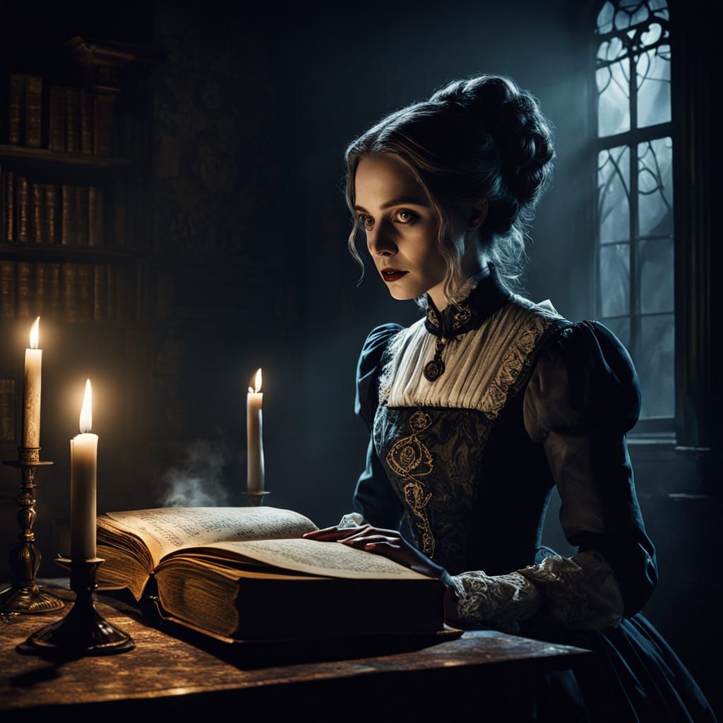 A striking picture of a woman absorbed in a book in a shadowy, candlelit room. The scene evokes Victorian gothic horror with its eerie atmosphere and supernatural elements, rendered as an oil painting.