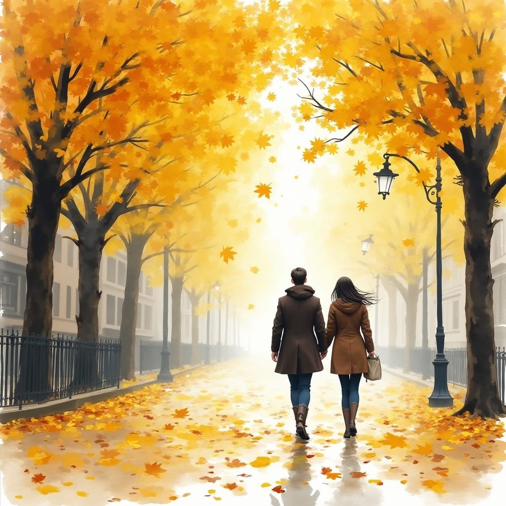 This image shows a watercolor painting of yellow leaves falling around two figures in a city, inspired by impressionistic techniques and warm, earthy tones.