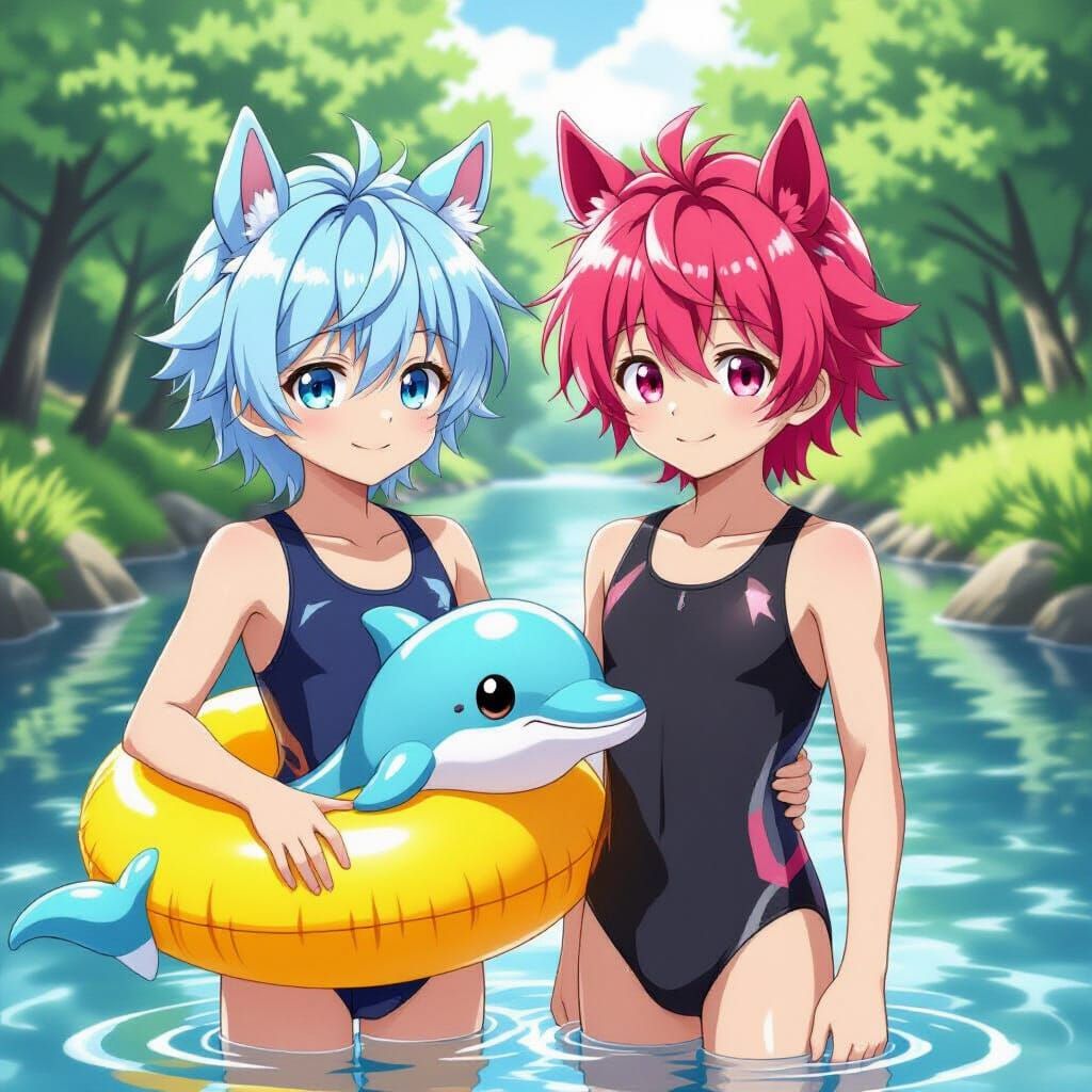 This image features two anime-style boys sporting horse ears and swimsuits, set against a river backdrop. One holds an inflatable dolphin, rendered with cinematic lighting and crisp, cel-shaded visuals.