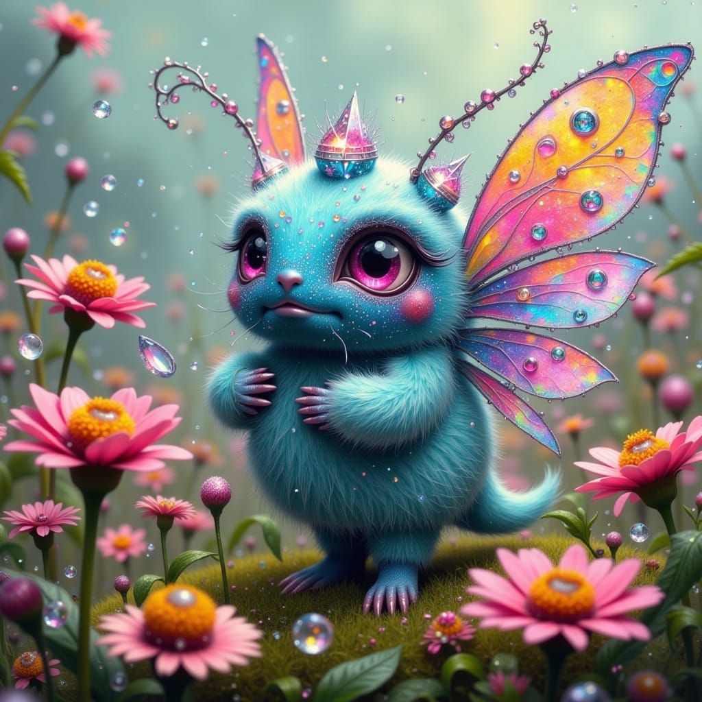 This enchanting image features a delicate, sparkly crystal-adorned fae in a vibrant meadow, surrounded by colorful zinnia flowers and showcasing a mesmerizing fusion of opalescent and luminous wing hues, set against a charming blue Gingham patterned background, reflecting a whimsical Fairy Punk aesthetic