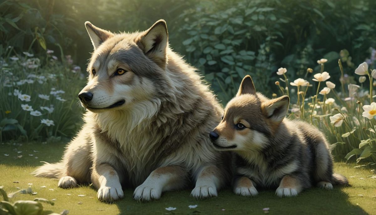 A charming watercolor illustration of a toddler and a wolf cub gazing at each other in a field of flowers. The artwork evokes a dreamy, fairy-tale-like aesthetic.