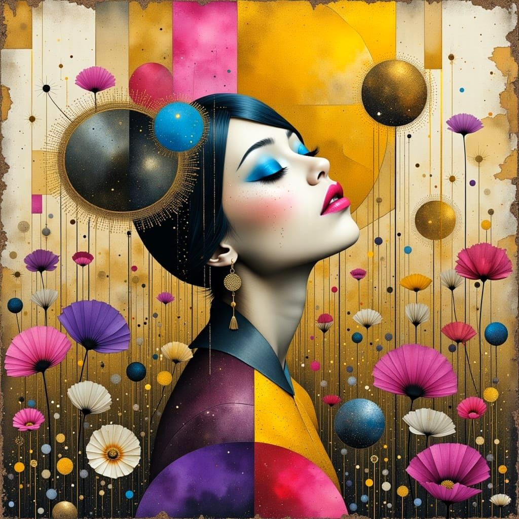 This image shows a beautiful woman surrounded by a lush meadow, basking in the warm sunlight. The artwork features a mix of bohemian and modern elements, with a focus on vibrant colors and textured brushstrokes, evoking a sense of surreal happiness.