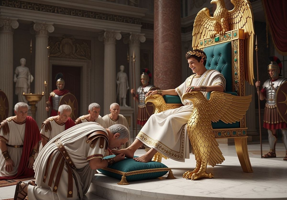 This image shows young Emperor Nero on an opulent throne, receiving homage from kneeling senators. Roman legionnaires stand guard as Nero extends his arm, laughing at the senator's humiliation.