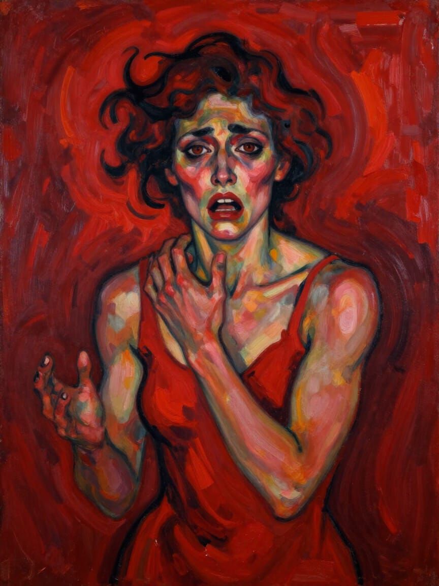 This image displays an intense emotional portrait of a woman, with red as the dominant color. Rendered in an Expressionist style, it features swirling shapes and raw gestures conveying deep feeling.