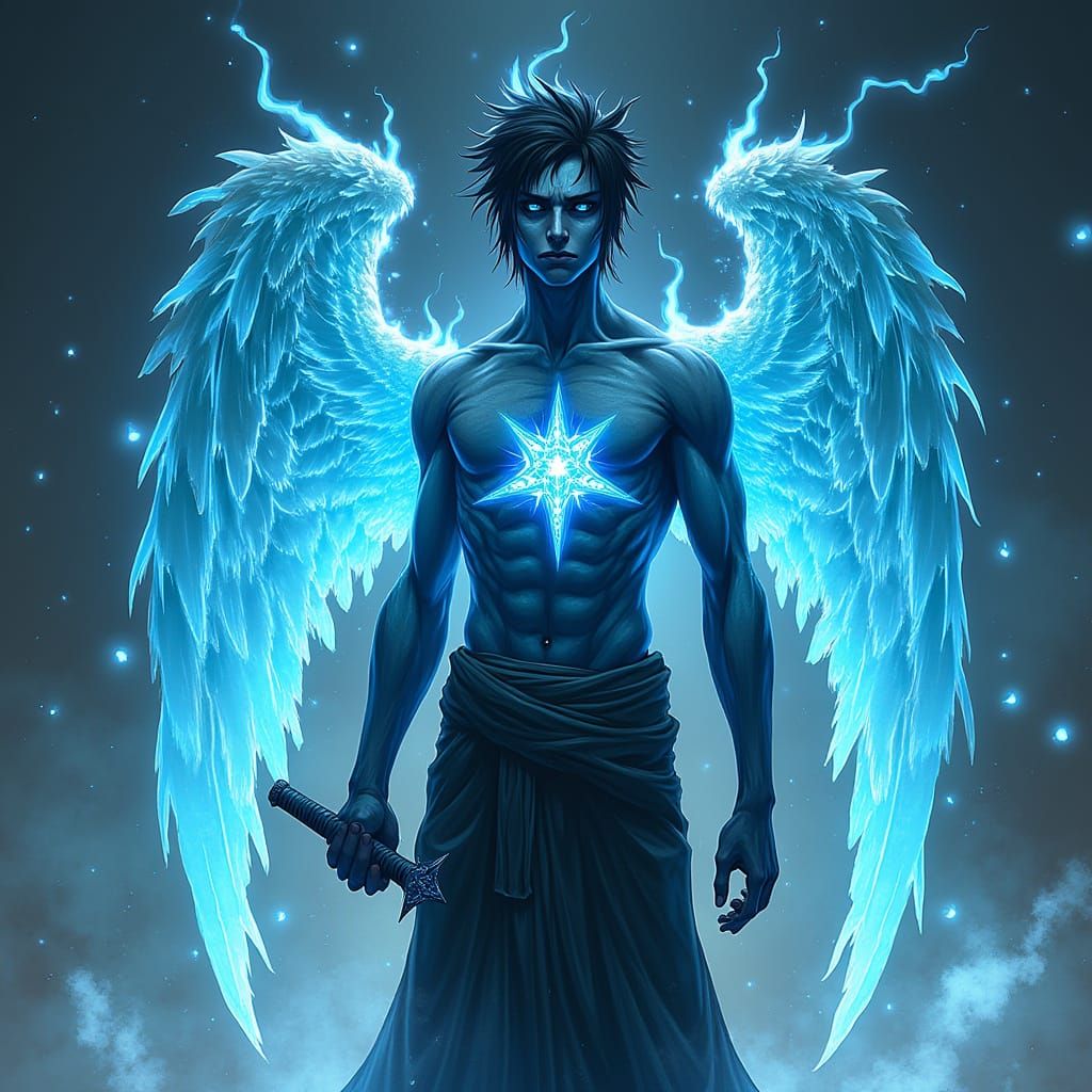 A powerful, lean figure with a warrior's physique stands proudly, surrounded by an aura of clarity and focus. Electric blue outlines and white embers dance around their being, while a six-pointed star burns at their forehead. Twin chakra wings unfold from their back, symbolizing their extraordinary abili...