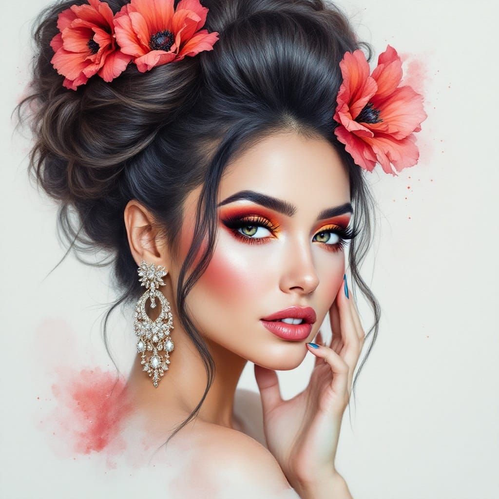 This image shows a stunning watercolor portrait of a woman with a bold hairstyle and striking red flowers in her hair, set against a realistic background.