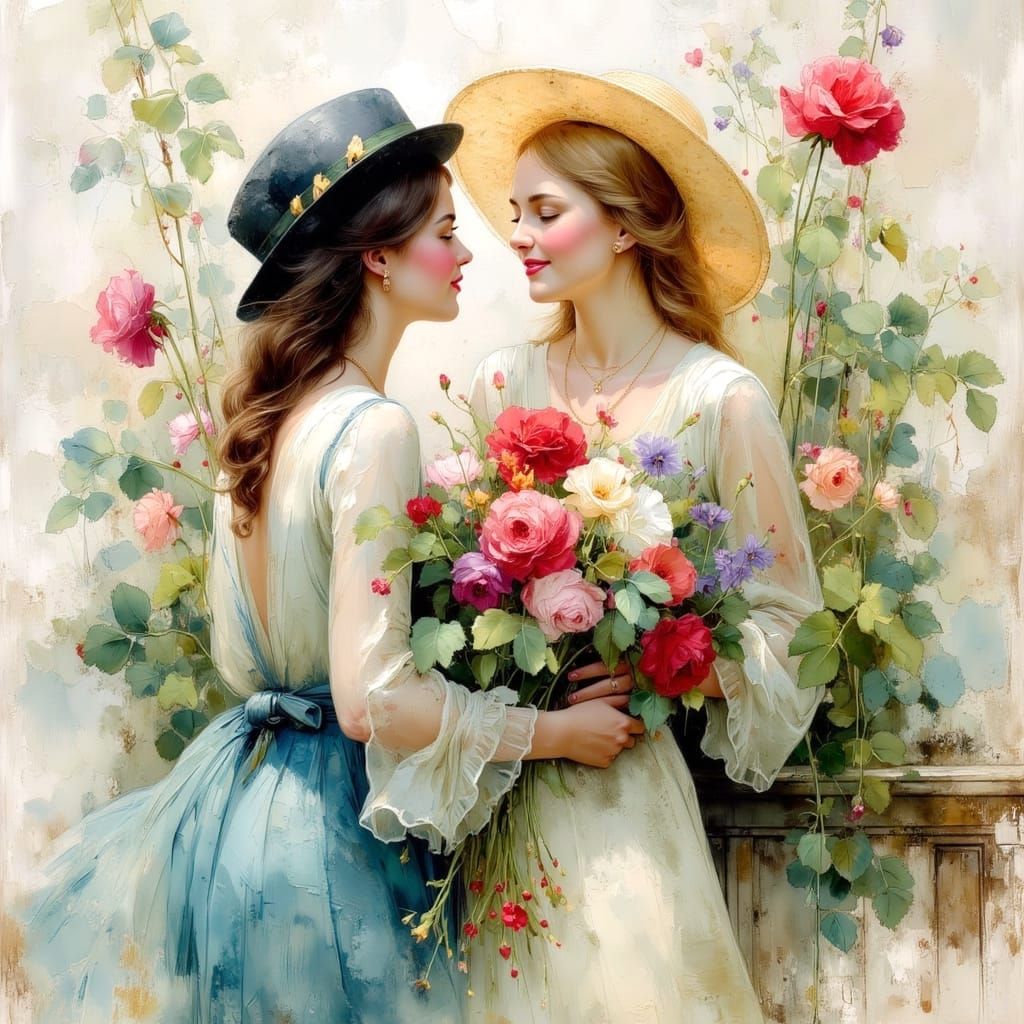 A poignant and beautiful image of a woman surrounded by wild roses, symbolizing the fleeting nature of love and beauty, set against a dreamy pastel backdrop