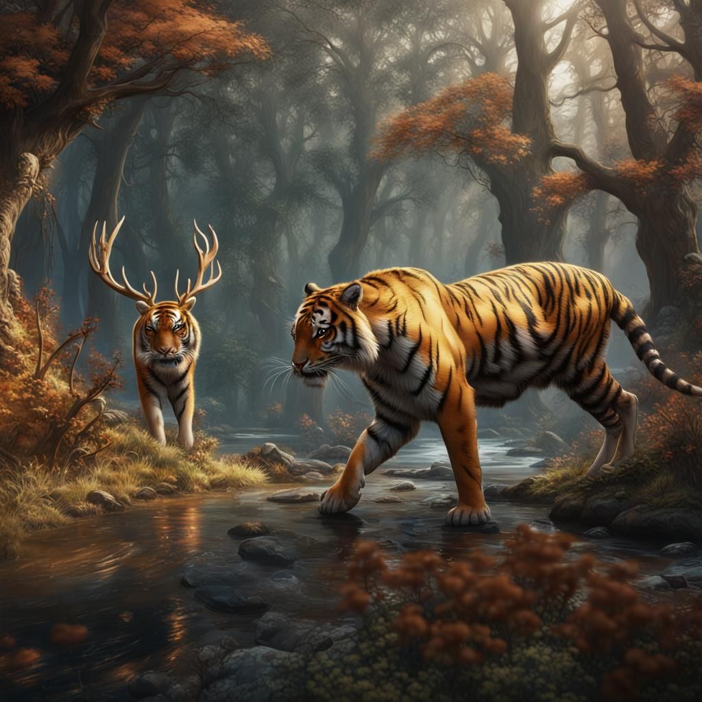 A detailed matte painting of a tiger hunting a deer in a fantastical landscape. The image features deep colors and intricate details, reminiscent of fantasy concept art.