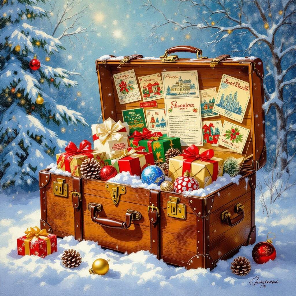 This image shows a vintage wooden suitcase adorned with travel stickers, filled with Christmas decorations. It's set against snowy pine trees, evoking a festive holiday scene in a traditional oil painting style with warm lighting.