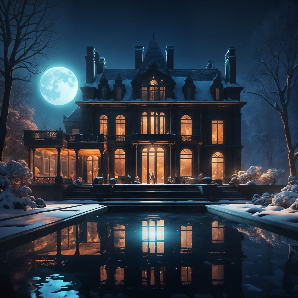 A serene scene of a woman stepping out of a warm indoor pool within a luxurious modern mansion, set against a stark contrast of a moonlit winter landscape outside, with vibrant triadic colors and intricate details.
