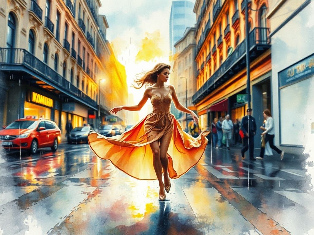 A beautiful woman dances in the rain on a busy city street corner, captured in a watercolor style reminiscent of Jean-Baptiste Monge's work, with intricate details and colorful, playful reflections