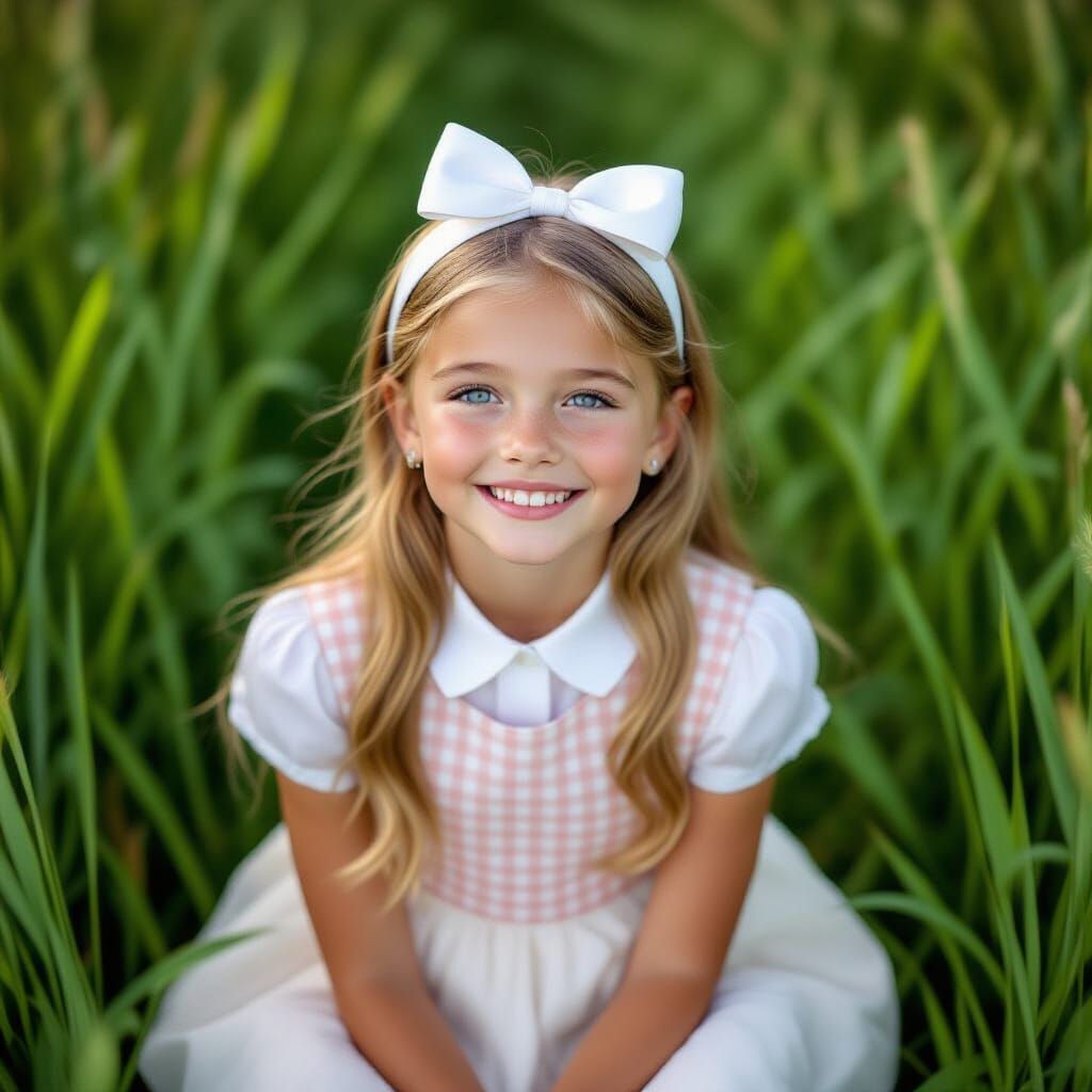 This image shows a beautiful 13-year-old girl sitting in a green field. Captured from above, the photo has a natural and effortless style, reminiscent of classic portrait photography.