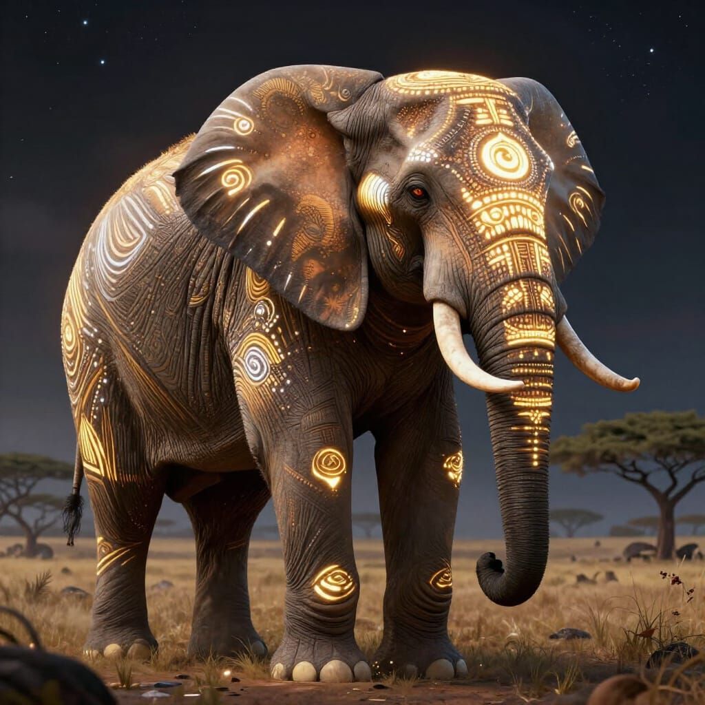 Generate your own unique elephant art with glowing tribal patterns. Free and easy AI image creation.