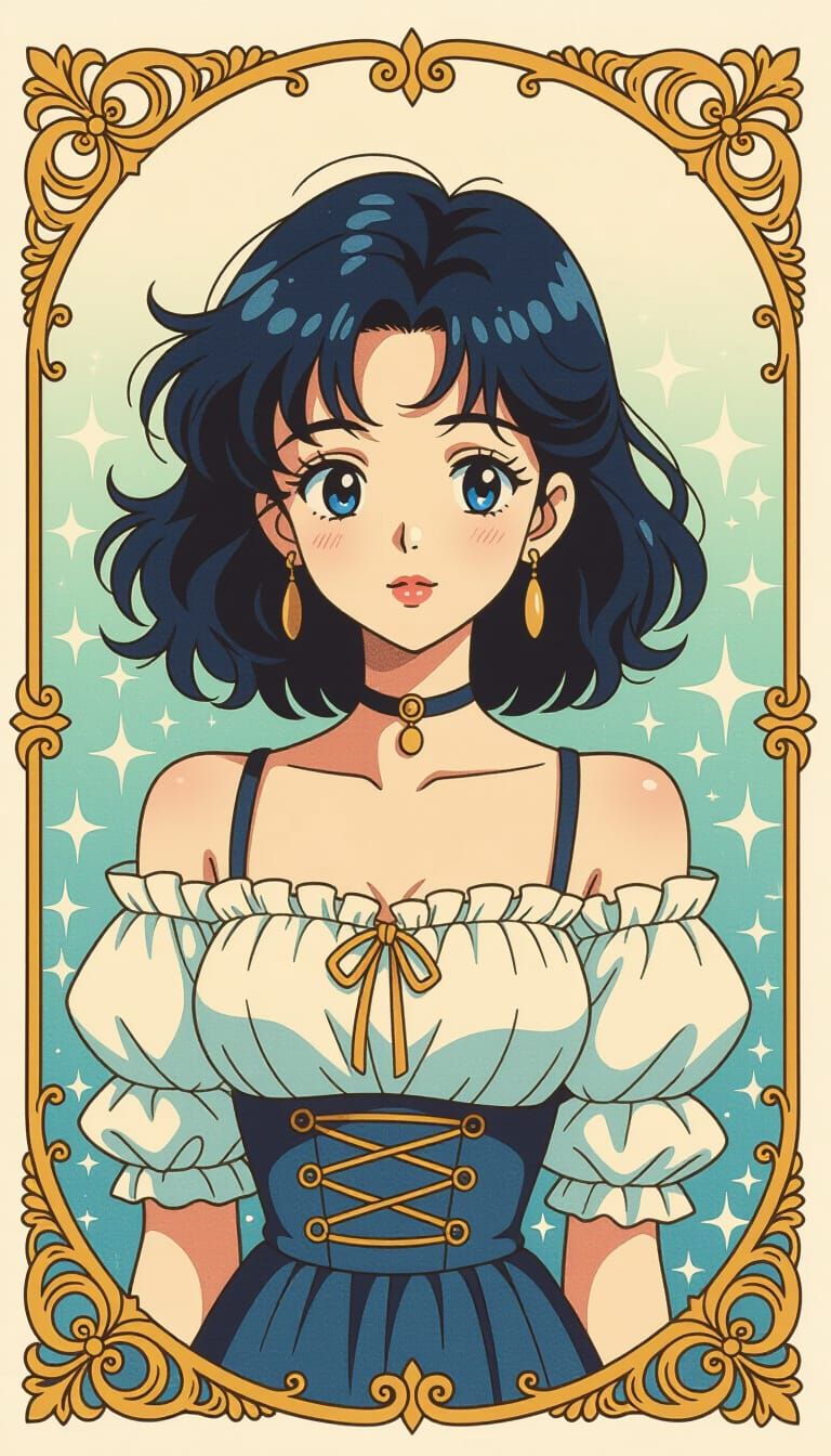 This image shows a vibrant anime-style portrait with expressive colors and smooth lines, reminiscent of a vintage 1980s animated movie. The artwork is in a kawaii aesthetic.