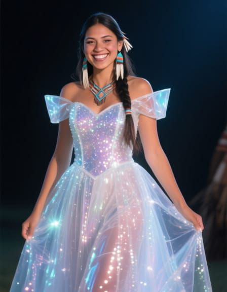 A beautiful Native American woman smiles while wearing a sparkling, transparent glass dress that appears to glow. This full-body image captures the unique and radiant attire.