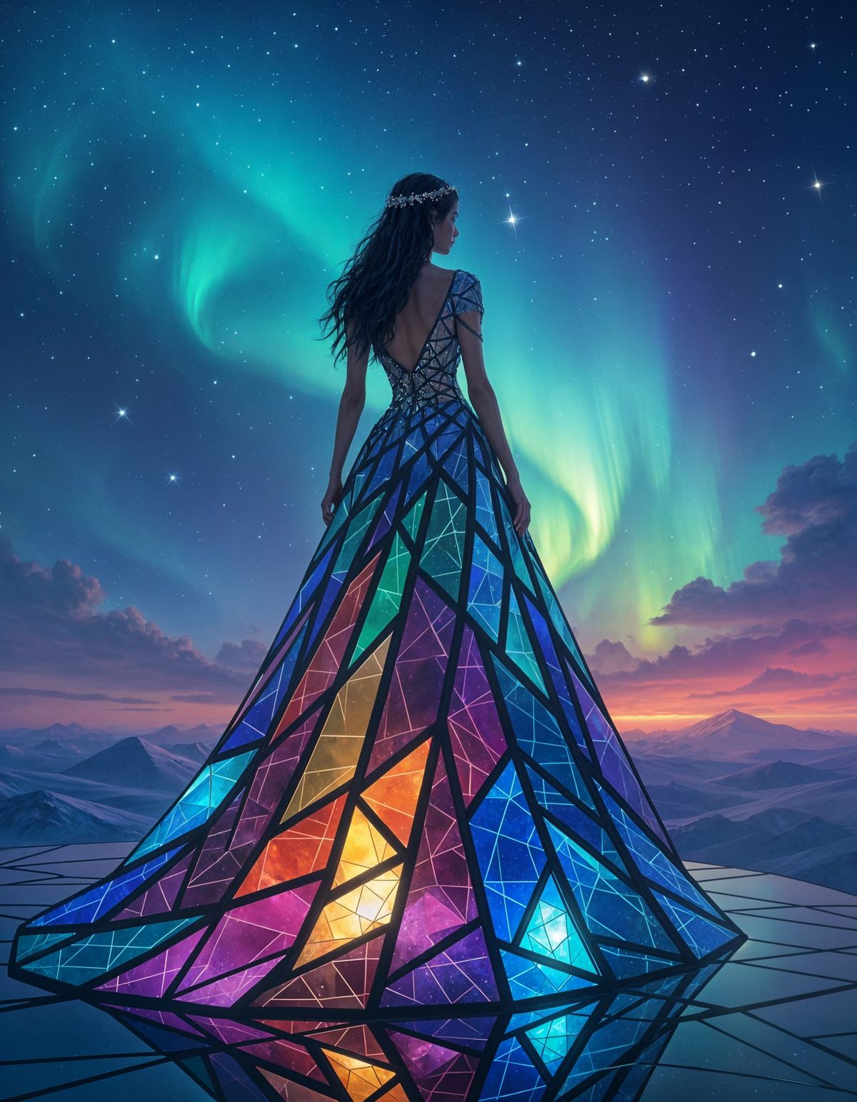 This digital painting showcases a regal figure in a gown of shattered stained glass, reflecting a cosmic aurora. The detailed fantasy art features vibrant colors and dramatic lighting, creating an ethereal masterpiece.