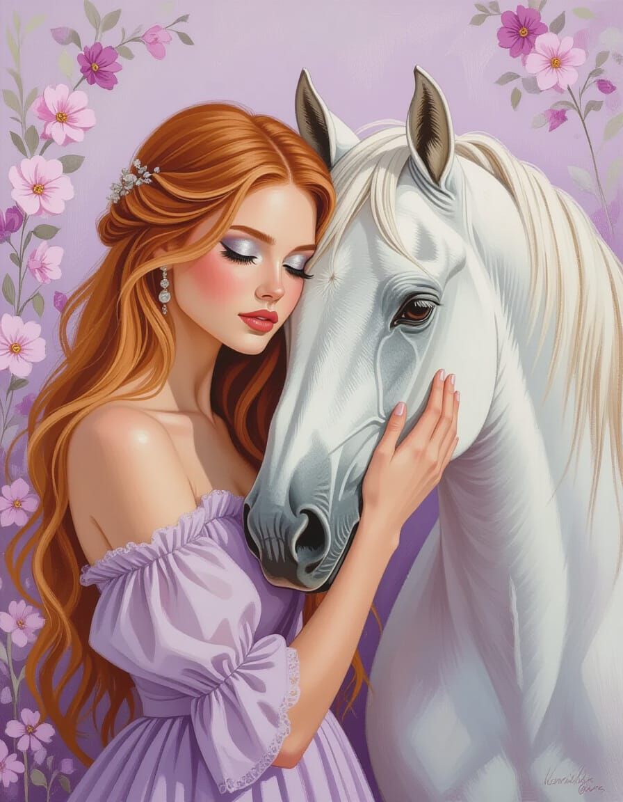 This image shows a fair-haired woman in a lilac dress gently touching a white horse. The pastel scene is filled with floral textures, rendered with delicate details to create a dreamy, ethereal atmosphere in an impressionistic style.
