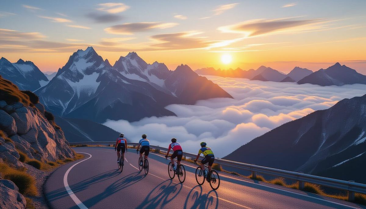 A vibrant image of cyclists ascending a winding mountain road above the clouds, bathed in dramatic sunrise light. The artwork blends surrealist, romantic, and dynamic artistic styles.