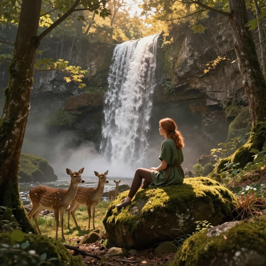 A tranquil scene of a woman on a boulder near a waterfall, with deer grazing nearby. Rendered in a luminous, painterly style with golden hour lighting.