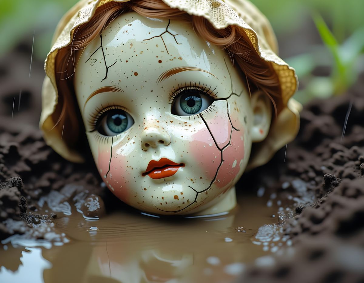 Gothic horror. Extreme close-up. A decaying porcelain doll's face lies half-buried in a muddy graveyard. Raindrops glisten on its cracked surface. The doll's vacant eyes stare blankly into the camera. Inspired by Zdzisław Beksiński and H.R. Giger. Dark, muted colors. High contrast. A masterpiece, best quality, 8k resolution, trending on Artstation, Unreal Engine 5, intricate detail, dramatic composition.