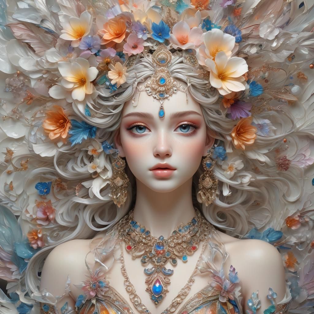 This image shows a multicolored goddess with striking eyes emerging from a flower. The scene is brought to life by subtle, shimmering embellishments and translucent petals.