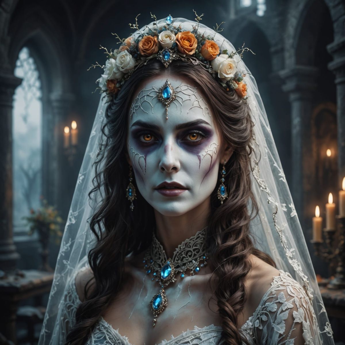 This image shows a stunning ethereal bride in a ghostly portrait. The artwork features deep colors and intricate details, rendered as a matte painting in a fantastical style.